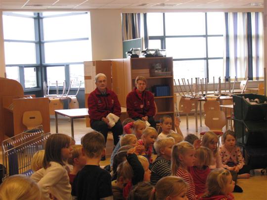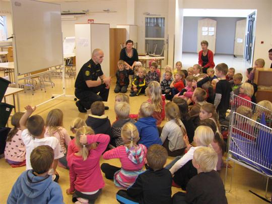 Í tilefni Heilsu- og forvarnarviku fengum við Krissa löggu í heimsókn. Fræddi hann nemendur um hvað þarf að varast á leiðinni í skólann og hvernig nota á endurskinsmerki. Einnig ræddi hann um nauðsyn þess að nota reiðhjólahjálma og mikilvægi þess að þeir séu rétt settir á og rétt stilltir. Til að undirstrika mikilvægi hjálmsins sýndi hann þeim ósoðið egg sem hann setti í þar til gerðan frauðplast hjálm og lét detta í gólfið annars vegar í hjálminum og hins vegar án hjálmsins. Nemendum brá mikið þegar eggið skall óvarið í gólfið og slettist út um allt og voru allir sammála um að nota alltaf hjálminn þegar þeir eru úti að hjóla.