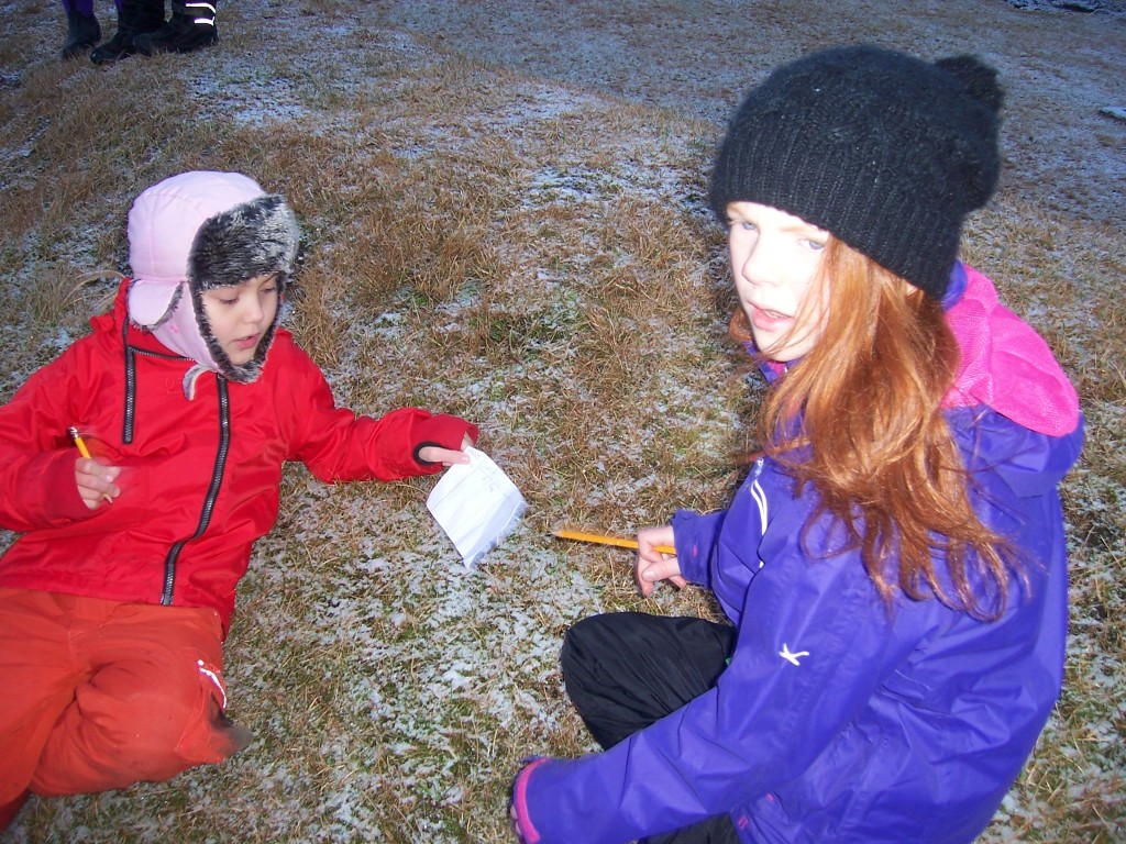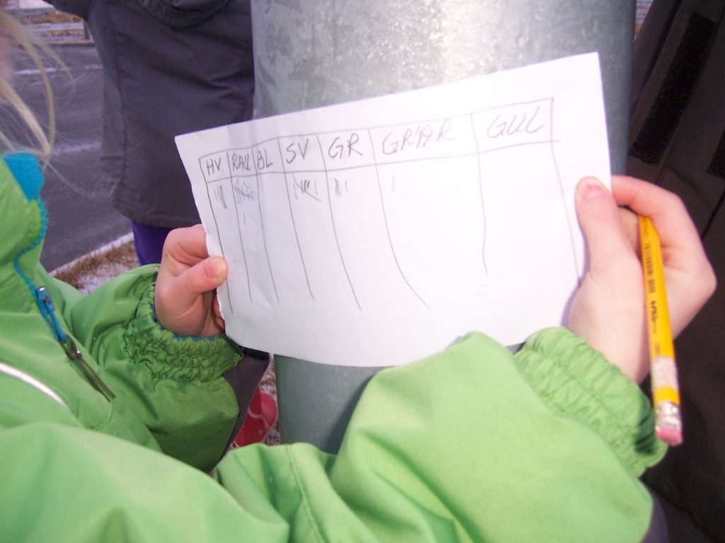 Talningin stóð yfir í 10 mínútur og þá var gengið til baka í skólann og þar var unnið sameiginlega úr niðurstöðunum sem voru að gefa þeim heilmiklar upplýsingar eins og algengasta litinn og ef 70 bílar aka framhjá á 10 mínútum þá er líklegt að á 20 mínútum séu þeir 140 og svona er hægt að halda áfram. Á myndunum er hægt að sjá hversu vinnusöm krakkarnir eru og þau áttu erfitt með að hætta þegar þessar 10 mínútur voru liðnar.