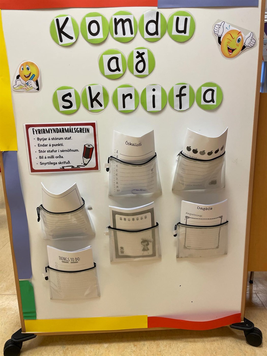 Í Akurskóla er lagt mikið uppúr læsishvetjandi umhverfi í skólastofunni. Eftir að kennarar sáu skemmtilega hugmynd af ritunarvegg hjá Margréti Ýr, kennara í byrjendalæsi í Hafnarfirði, voru nokkrir árgangar sem settu upp sinn ritunarvegg.